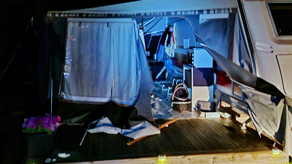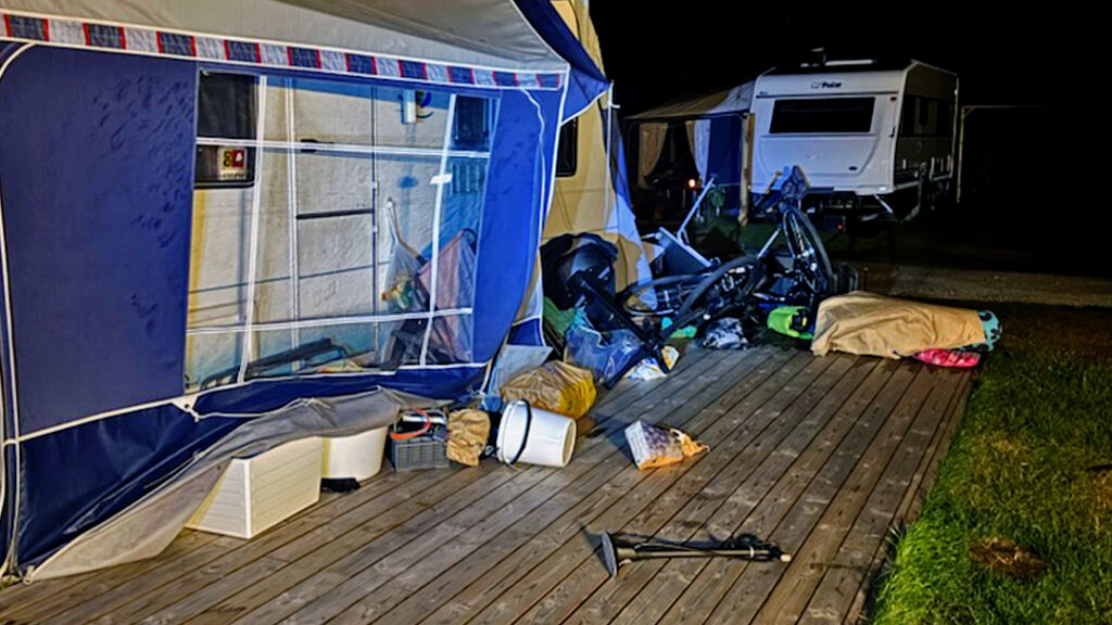 -Den ska ha lyft 5-6 husvagnar och förtält. Vi har varit i kontakt med 112 och tjänsteman i beredskap. Inga personskador vad vi vet, uppger ögonvittnen på plats.