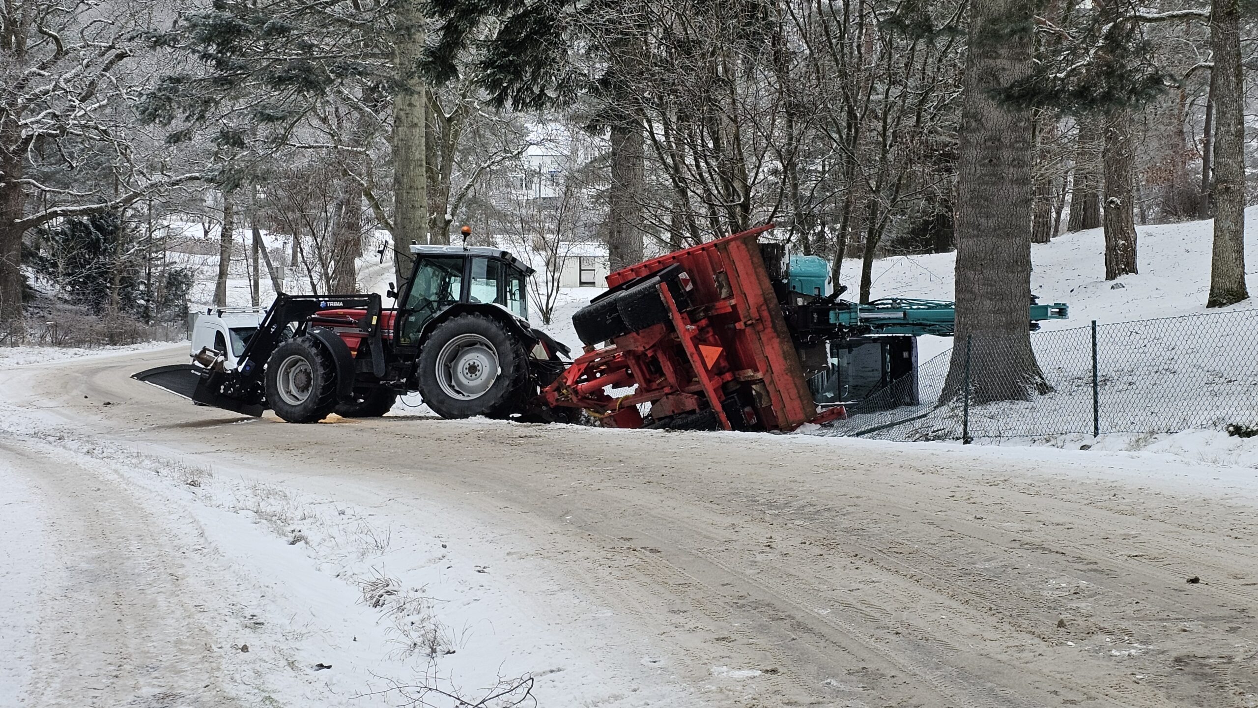Ett släp kopplat till en traktor har vält. På släpet stod en grävmaskin som ligger i diket och delvis in i en trädgård.