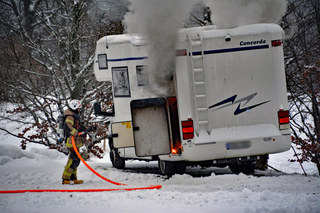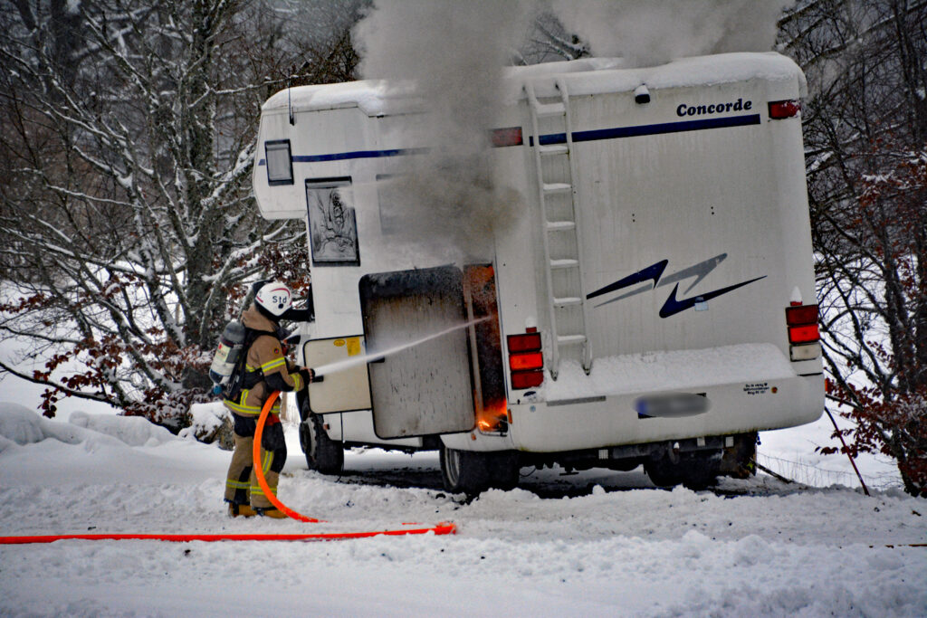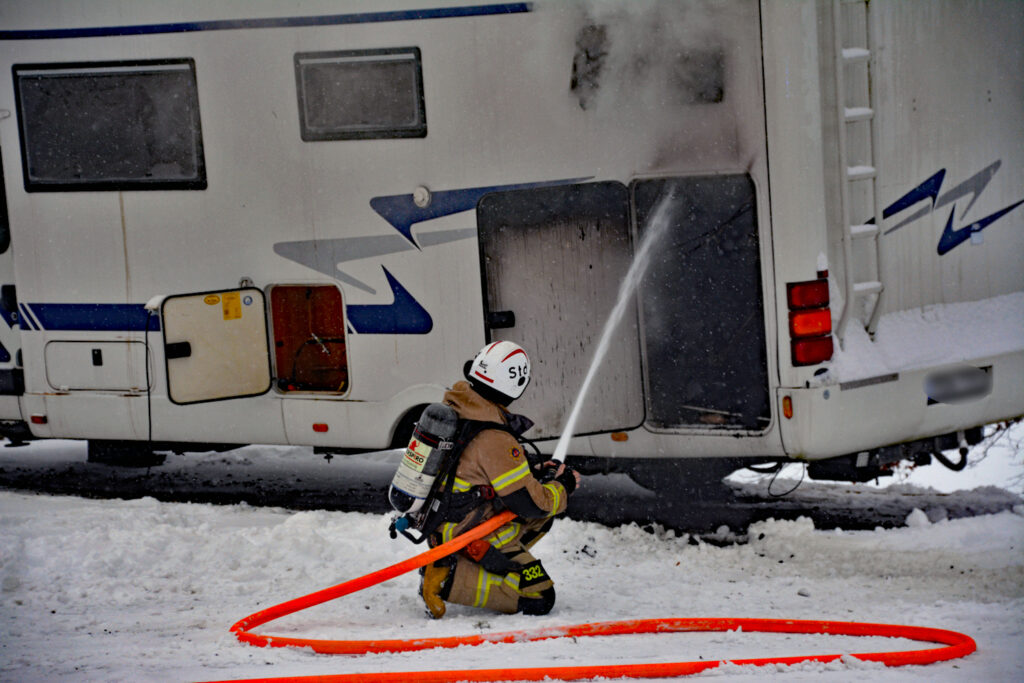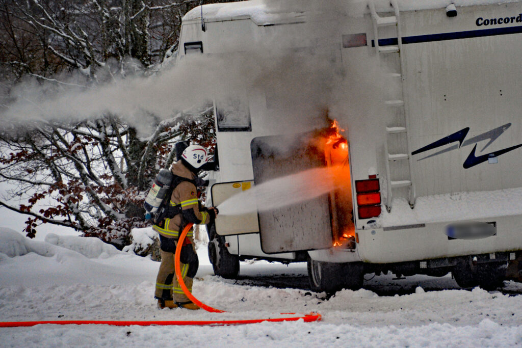 Ägare tog ut två gasolflaskor ur husbilen när man upptäckte rökutveckling. Det finns ingen spridningsrisk till andra fordon eller fastigheter.