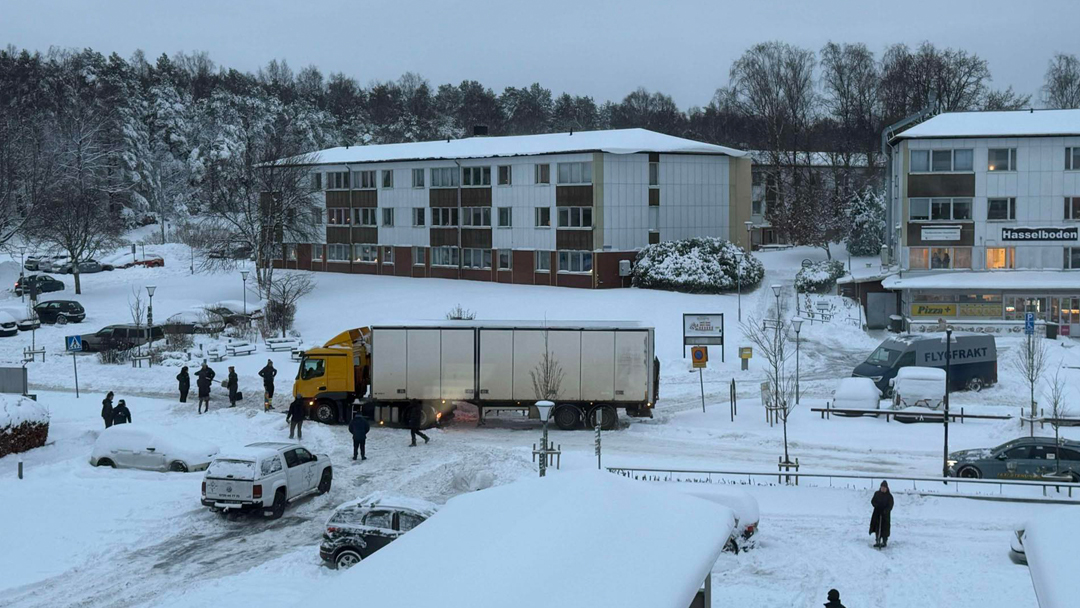 På torsdagseftermiddagen körde en lastbil fast inne på bostadsområdet Hasselbackens huvudgata. För tillfället kan man varken köra in eller ut ur området.