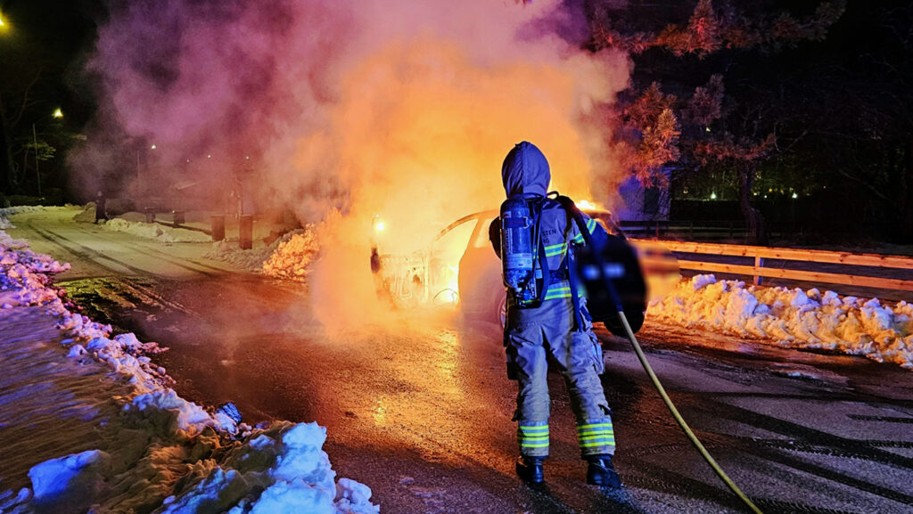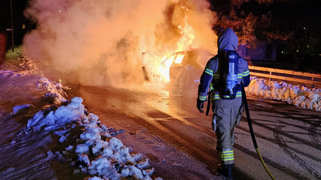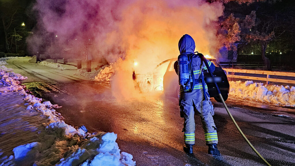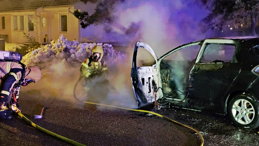 Larmet kom klockan 20:15 om en bil som börjat brinna under färd på Södra Vägen i Stenungsund. När räddningstjänst kom till platsen var bilen övertänd.
