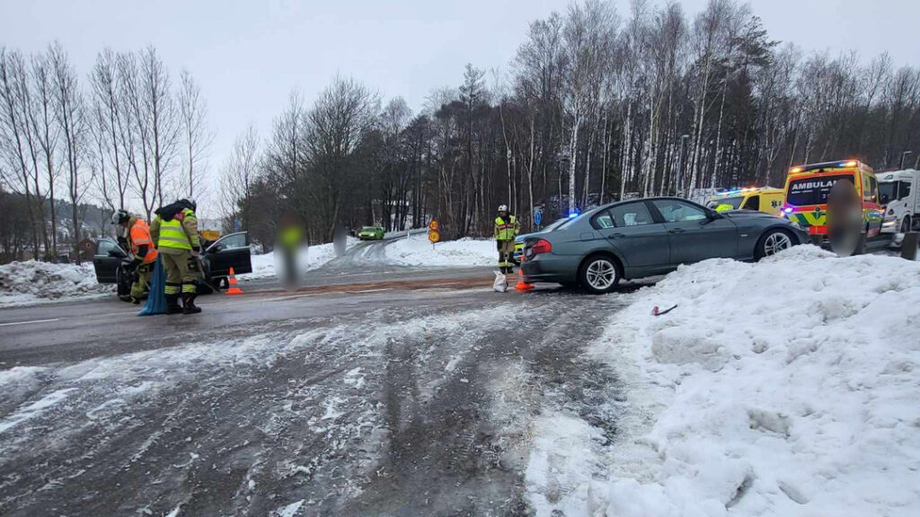 Det ska handla om en kollision mellan en personbil och en A-traktor. Inga synliga personskador men en person, förare av personbilen åker med ambulans till sjukhus för kontroll och vård.