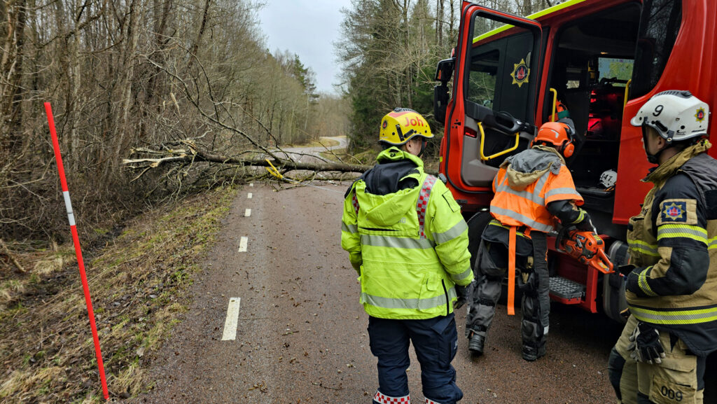 Under natten har arbete pågått med att röja vägar från nedfallna träd, och på flera håll har räddningstjänst, entreprenörer och frivilliga arbetat för att hålla viktiga sträckor framkomliga.