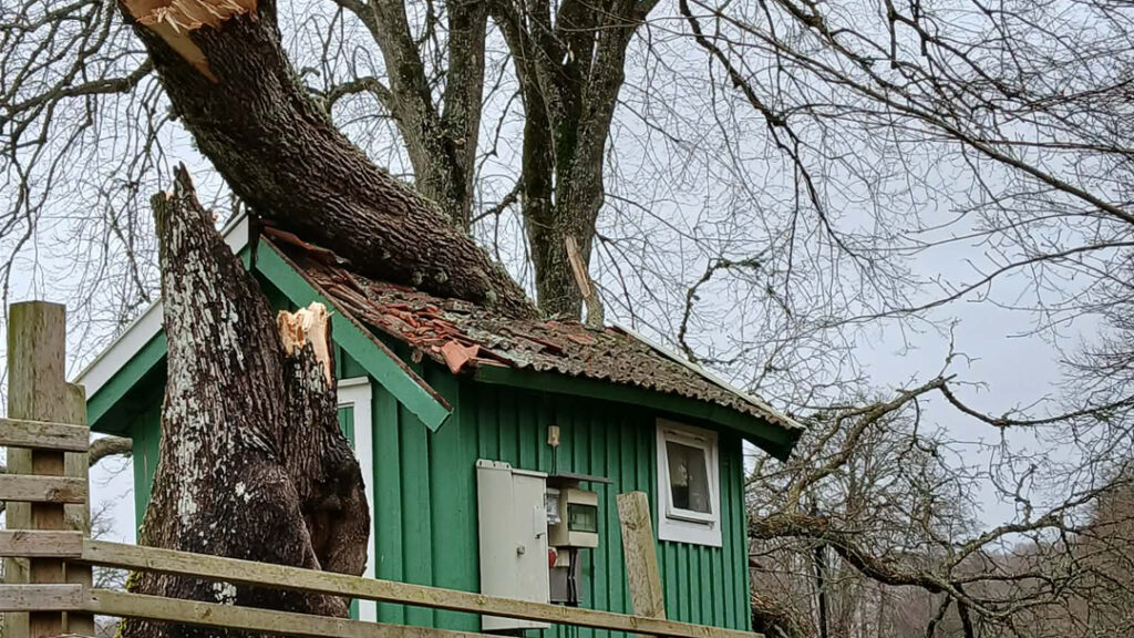 På måndagsförmiddagen larmades räddningstjänsten till Bräcke, Ödsmål – Stenungsund är ett träd vält över ett hus. Oklar omfattning men det finns inga rapporter om personskador.