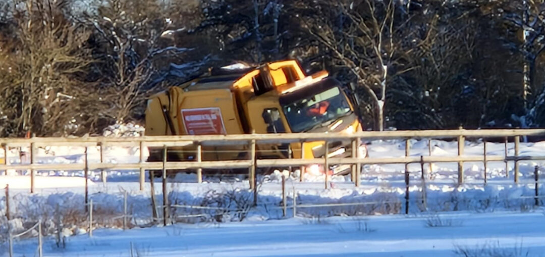 Även om många vägar är plogade är det fortfarande mycket halt och för renhållningsarbetare och sopbilar är det extra tufft att ta sig fram, främst på landsbygden. På Tjörn körde en sopbil av vägen i Rösselvik. 7000918