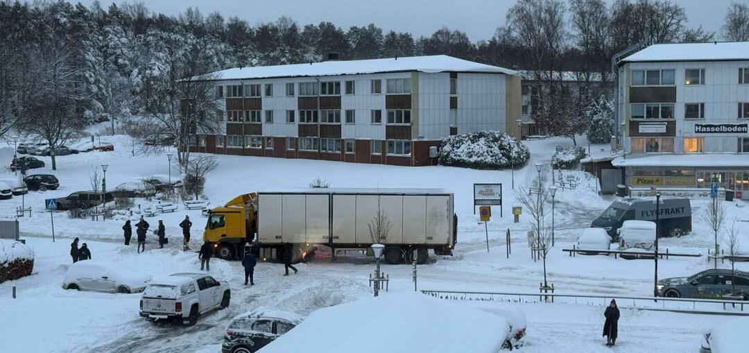 På torsdagseftermiddagen körde en lastbil fast inne på bostadsområdet Hasselbackens huvudgata. För tillfället kan man varken köra in eller ut ur området. 7000863
