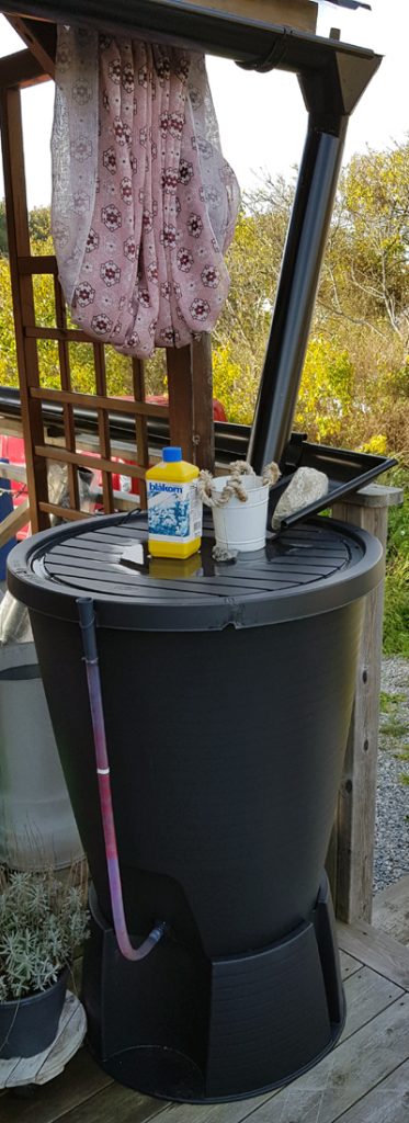 Bilden visar en vattentunna. Finns att köpa i te x byggvaruhandel. Här samlas vatten när det regnar och det kan sedan användas för att vattna blommor.